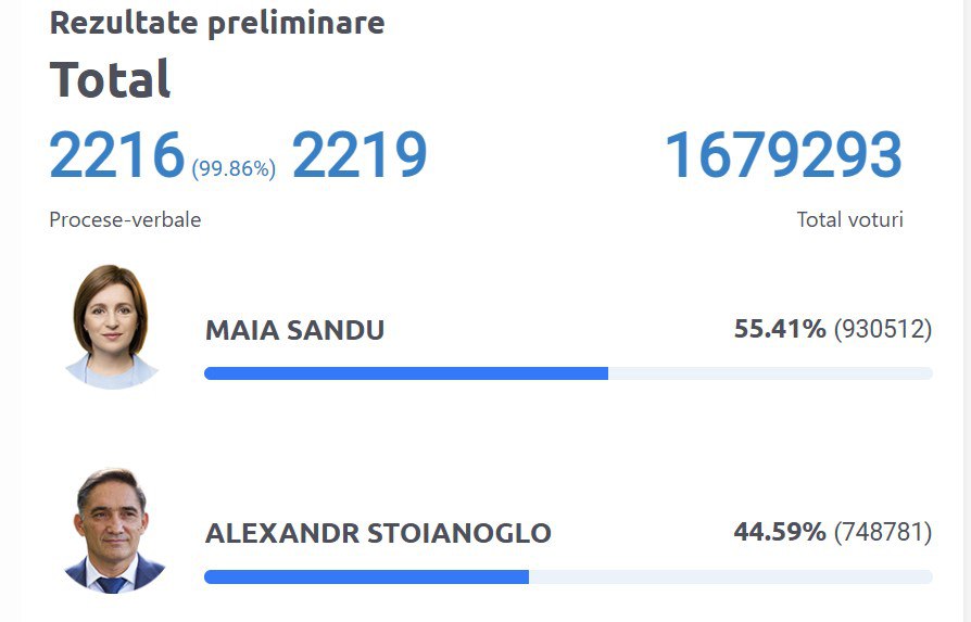 Станом на ранок 4 листопада з 99,86% опрацьованих голосів Санду підтримали 55.41% (930512) виборців, а Стояногло – 44.59% (748781).