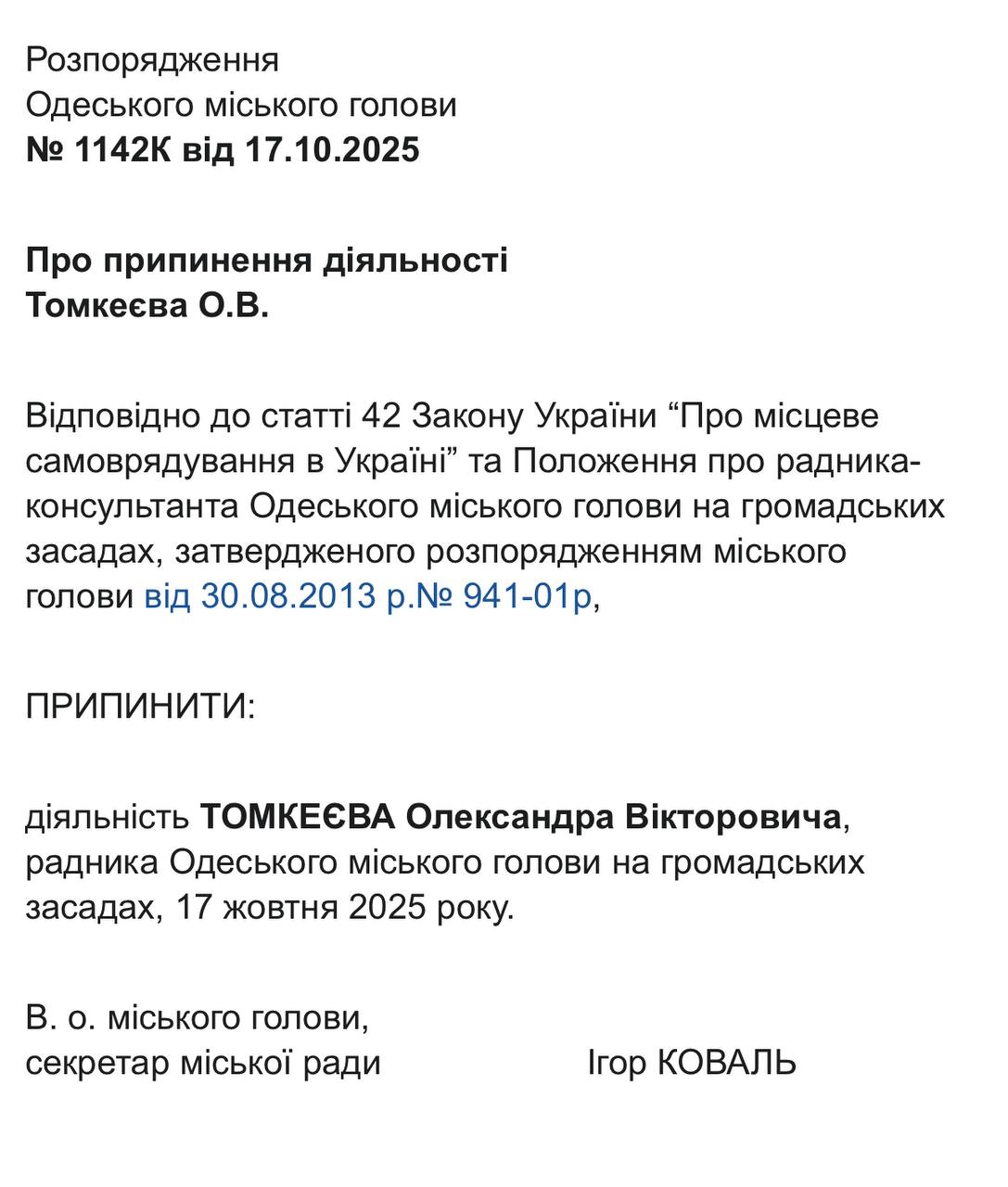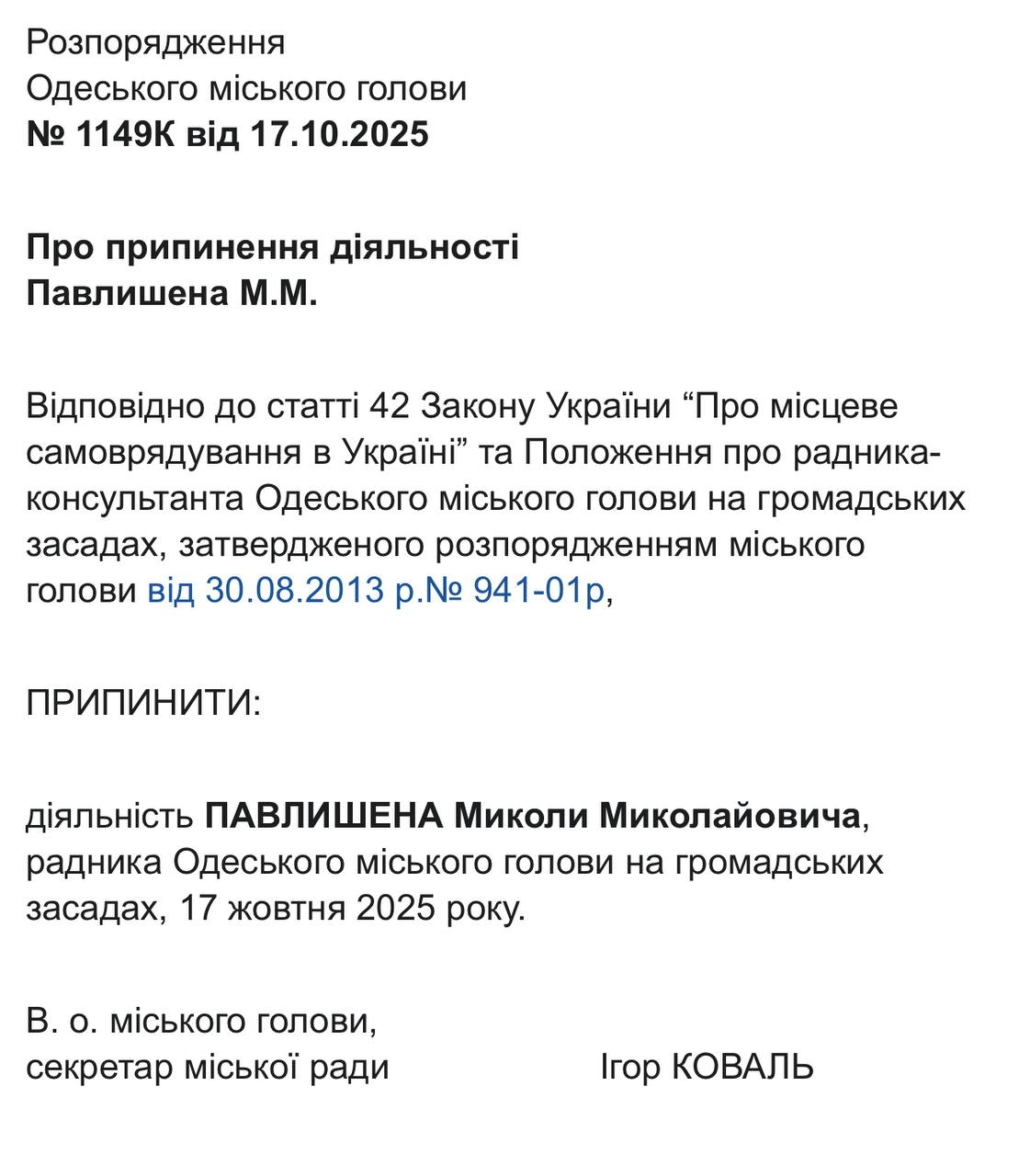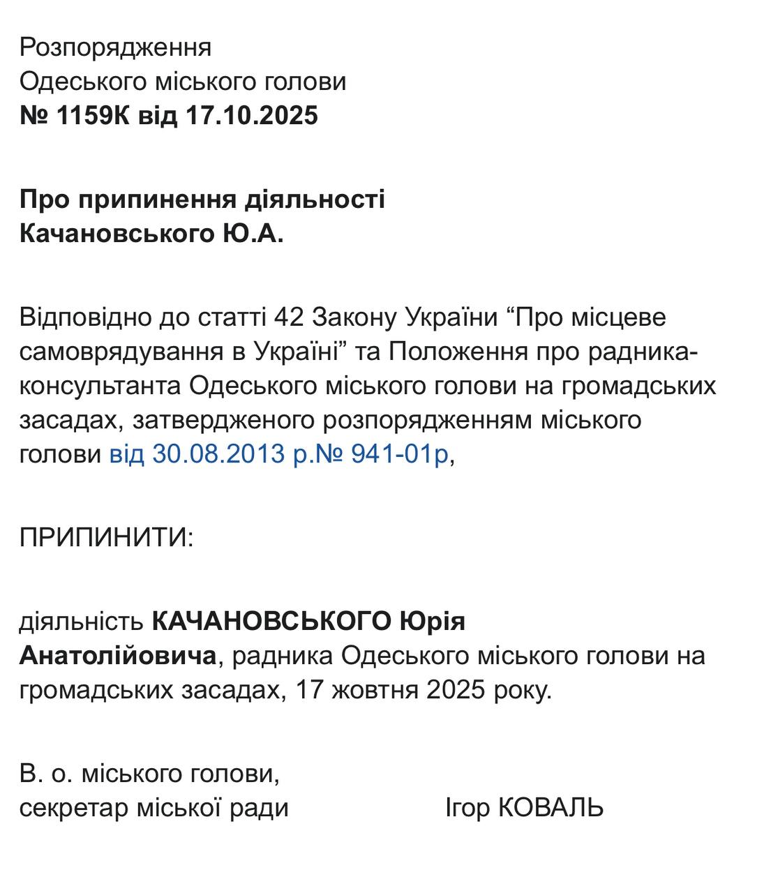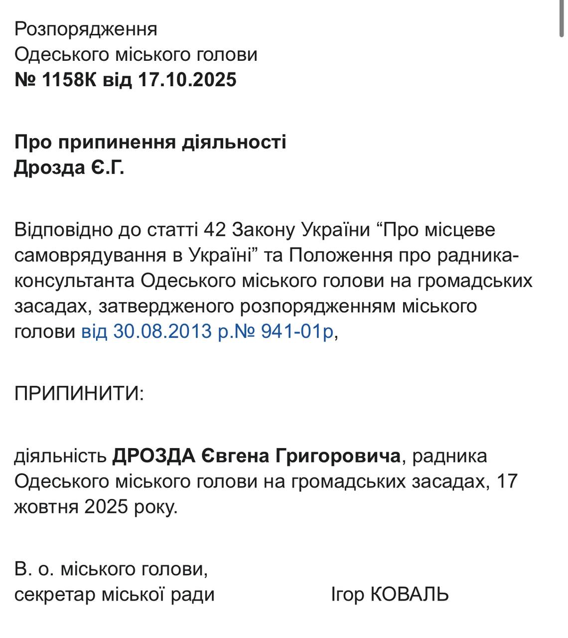 22 жовтня відповідні документи із розпорядженнями виконувача обов’язків міського голови, секретаря Одеської міської ради Ігоря Коваля, оприлюднили на сайті Одеської міської ради. Це стало наслідком втрати Трухановим українського громадянства, після чого він автоматично позбувся посади мера, передає Бессарабія.UA.