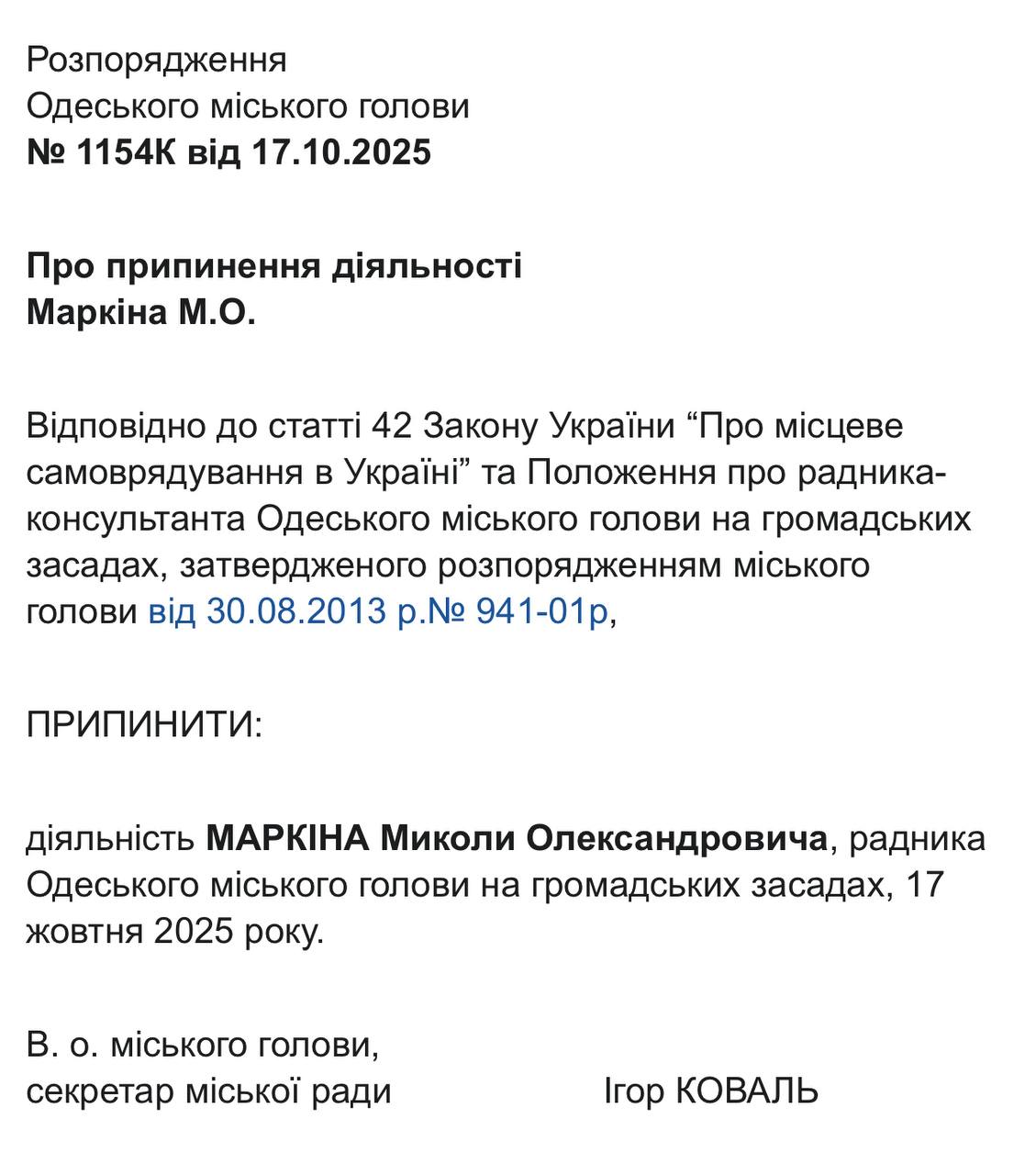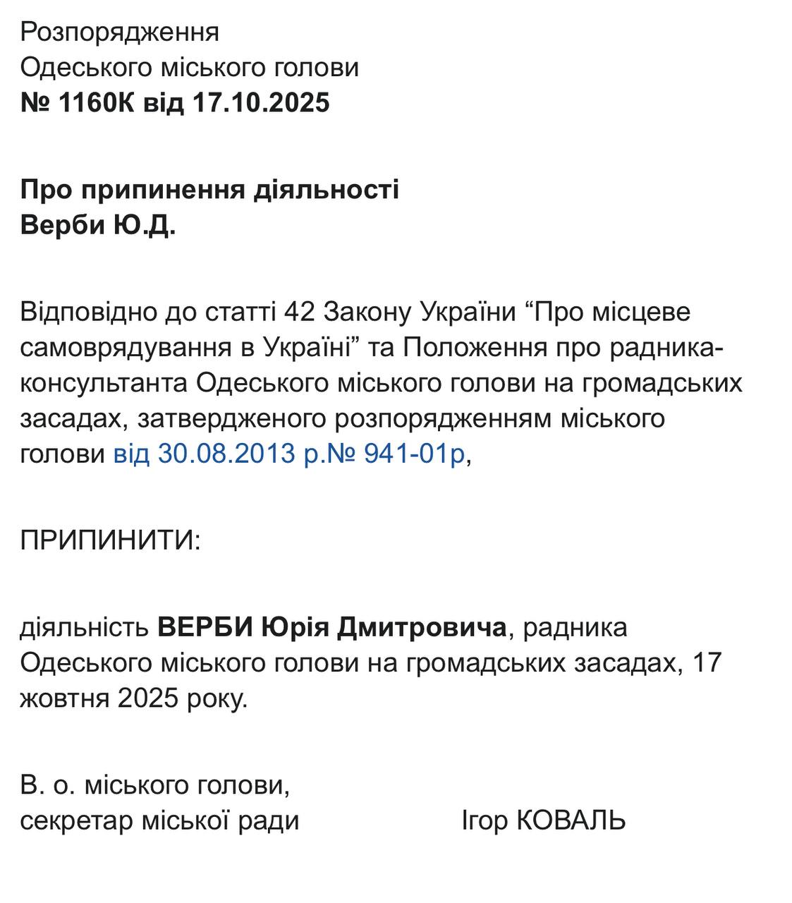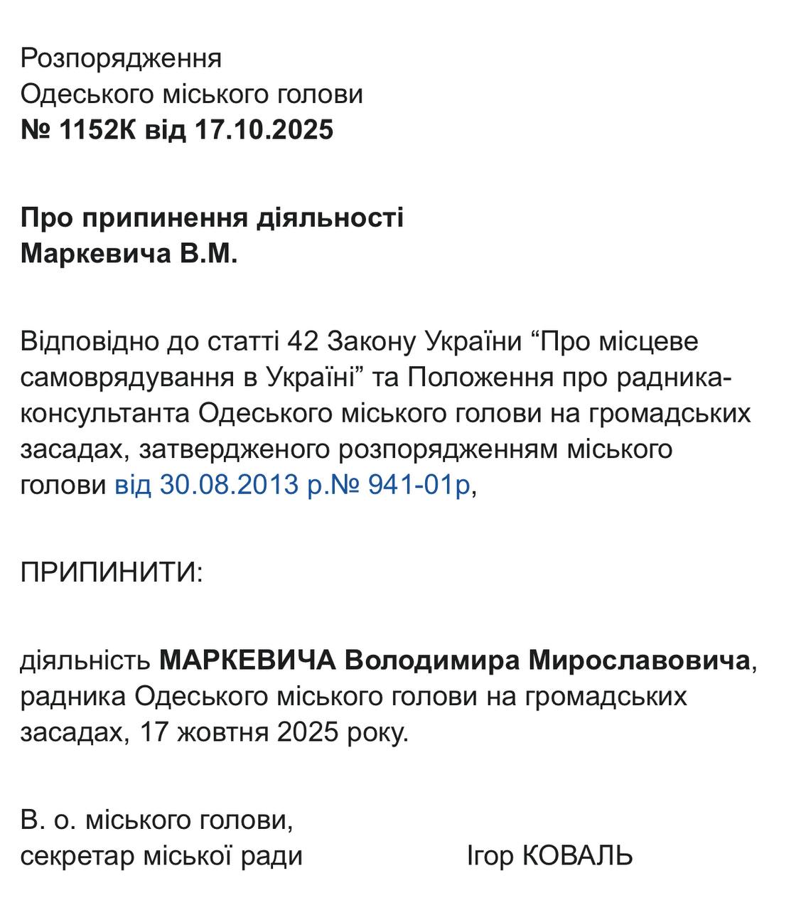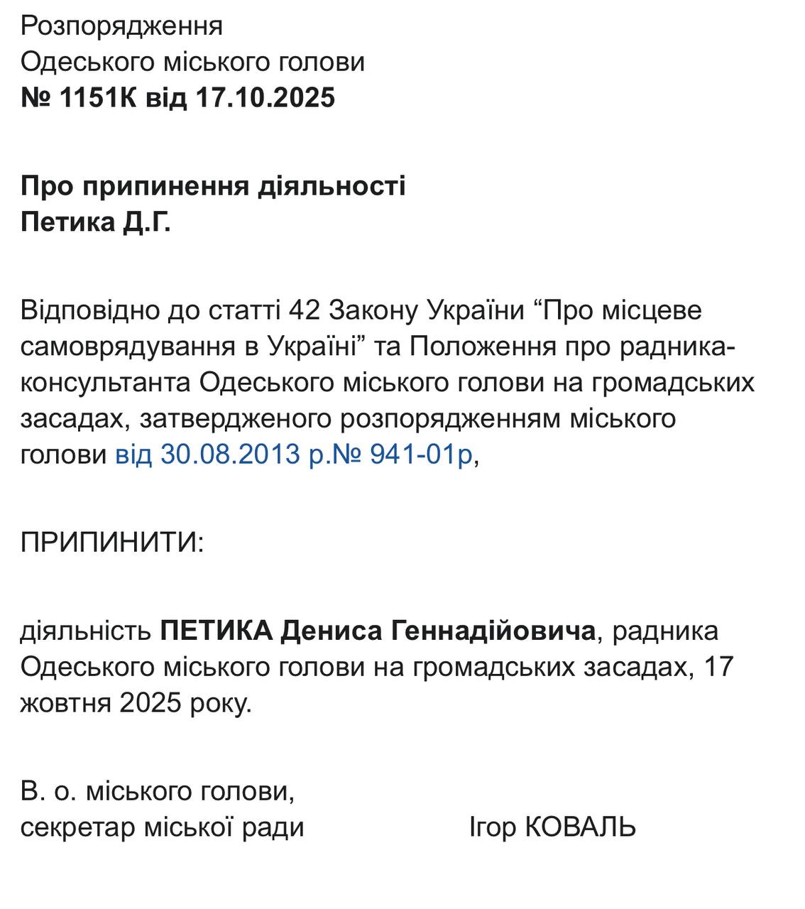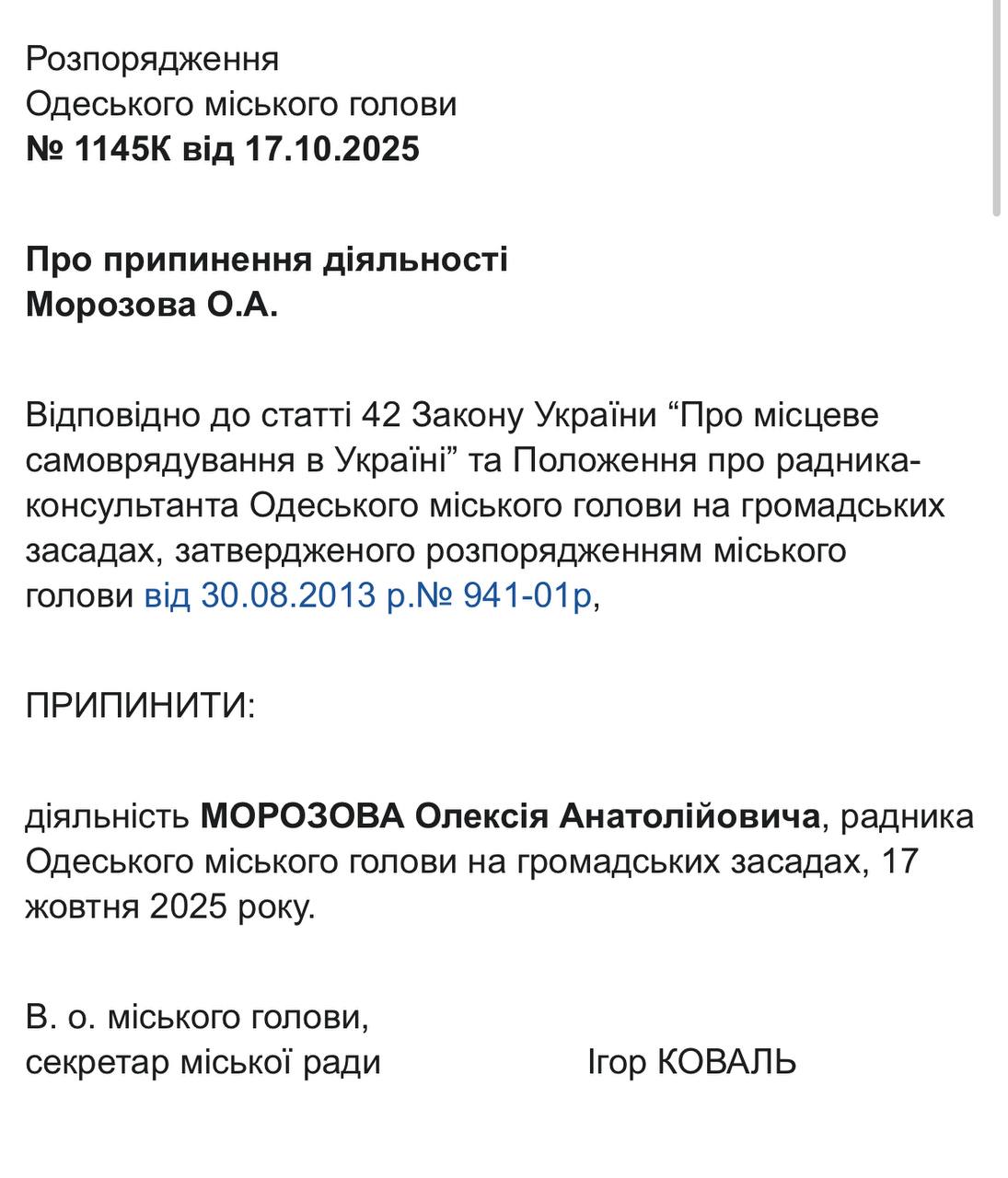 22 жовтня відповідні документи із розпорядженнями виконувача обов’язків міського голови, секретаря Одеської міської ради Ігоря Коваля, оприлюднили на сайті Одеської міської ради. Це стало наслідком втрати Трухановим українського громадянства, після чого він автоматично позбувся посади мера, передає Бессарабія.UA.