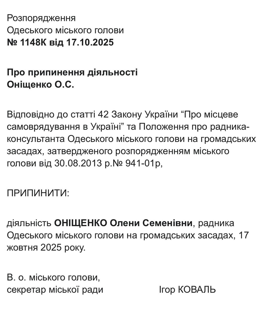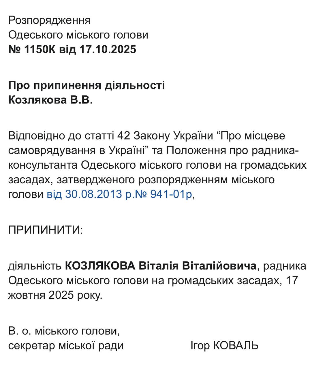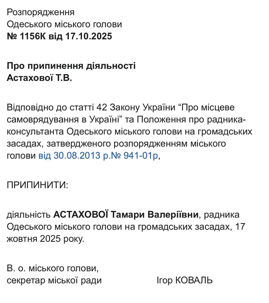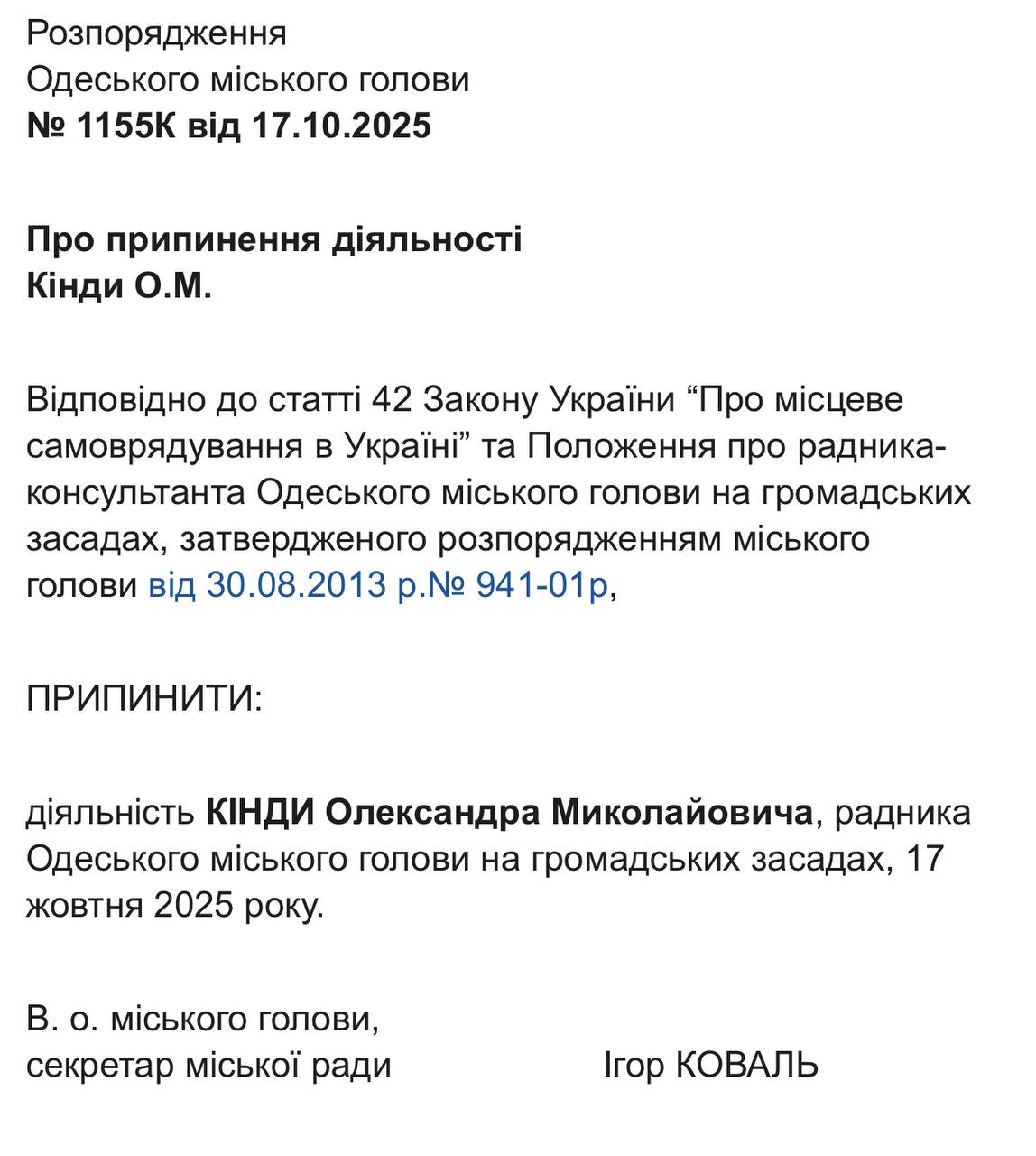22 жовтня відповідні документи із розпорядженнями виконувача обов’язків міського голови, секретаря Одеської міської ради Ігоря Коваля, оприлюднили на сайті Одеської міської ради. Це стало наслідком втрати Трухановим українського громадянства, після чого він автоматично позбувся посади мера, передає Бессарабія.UA.