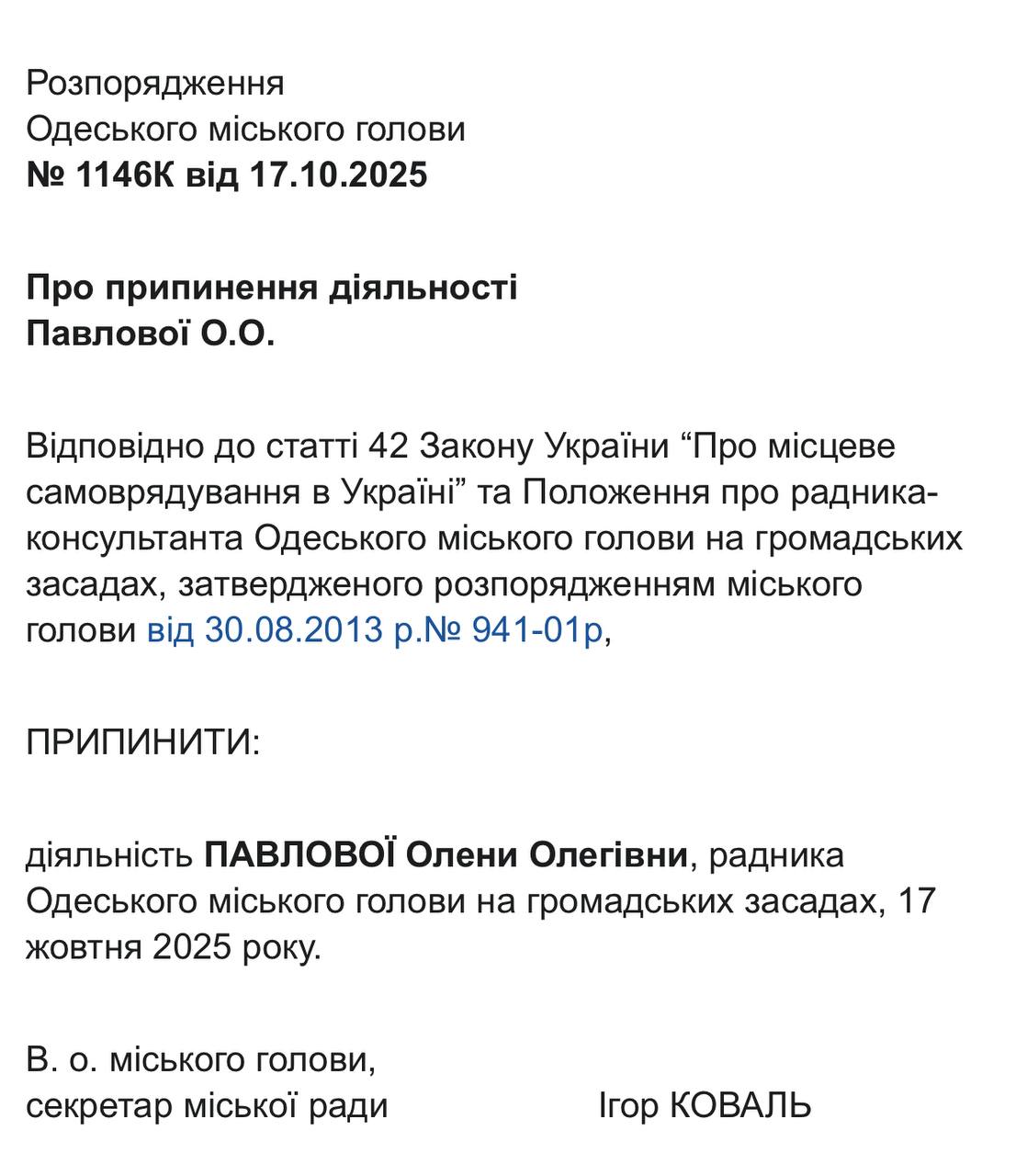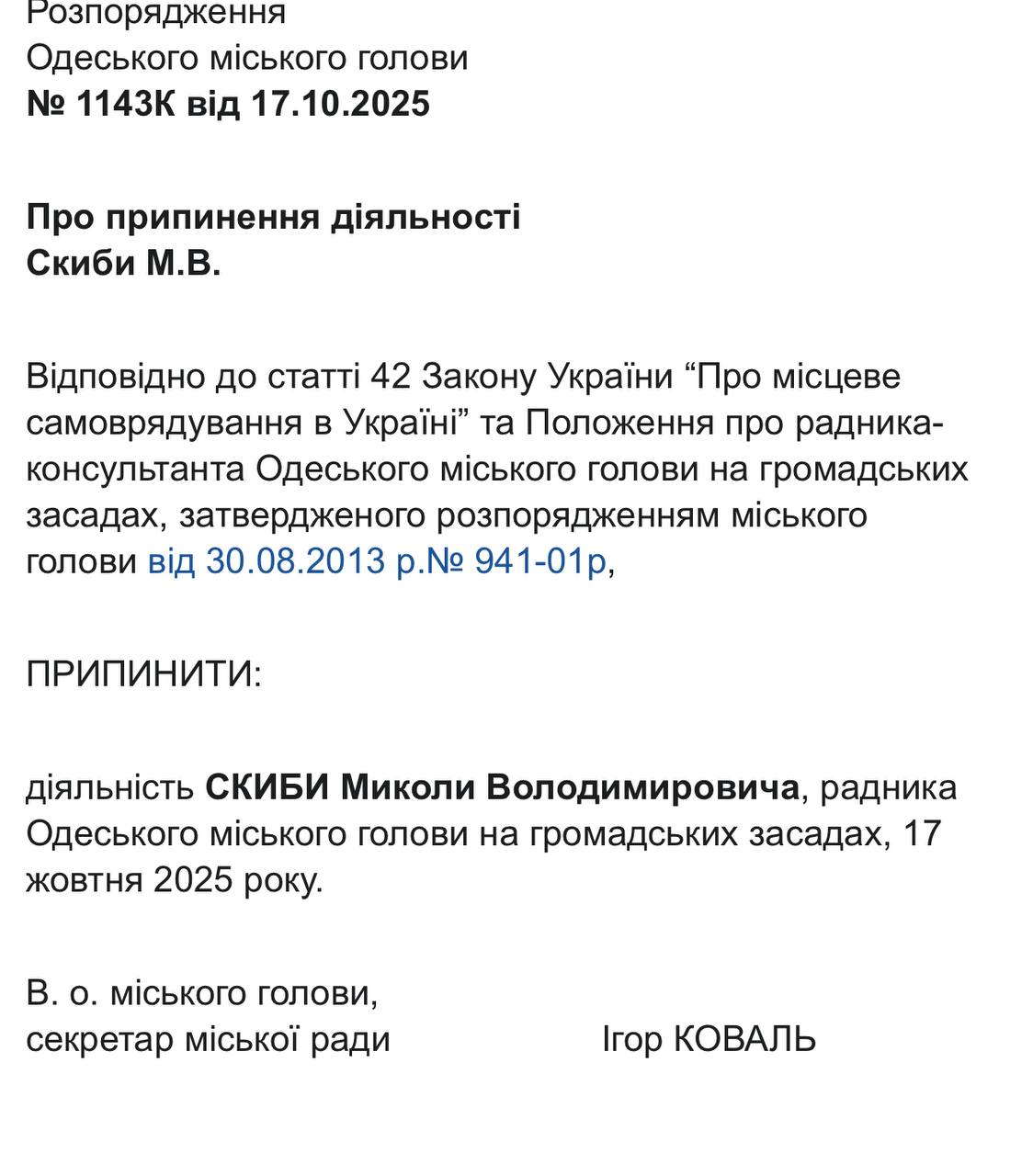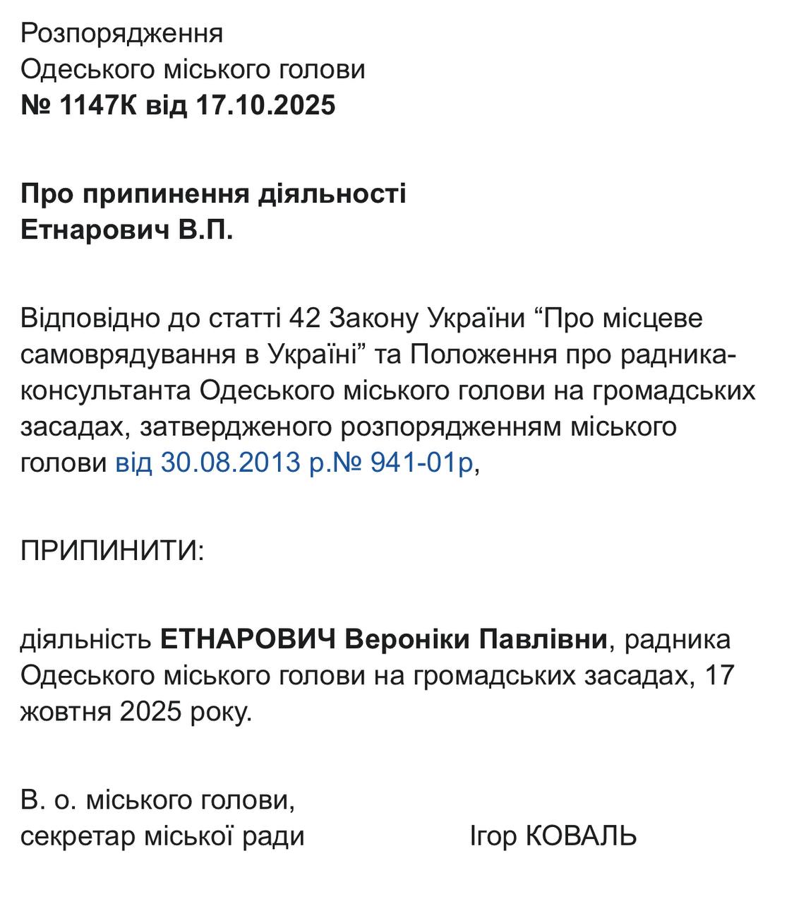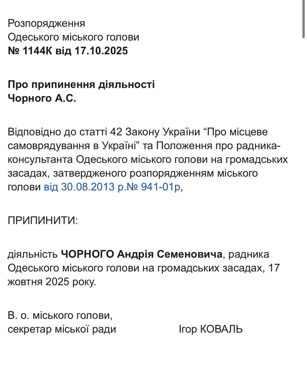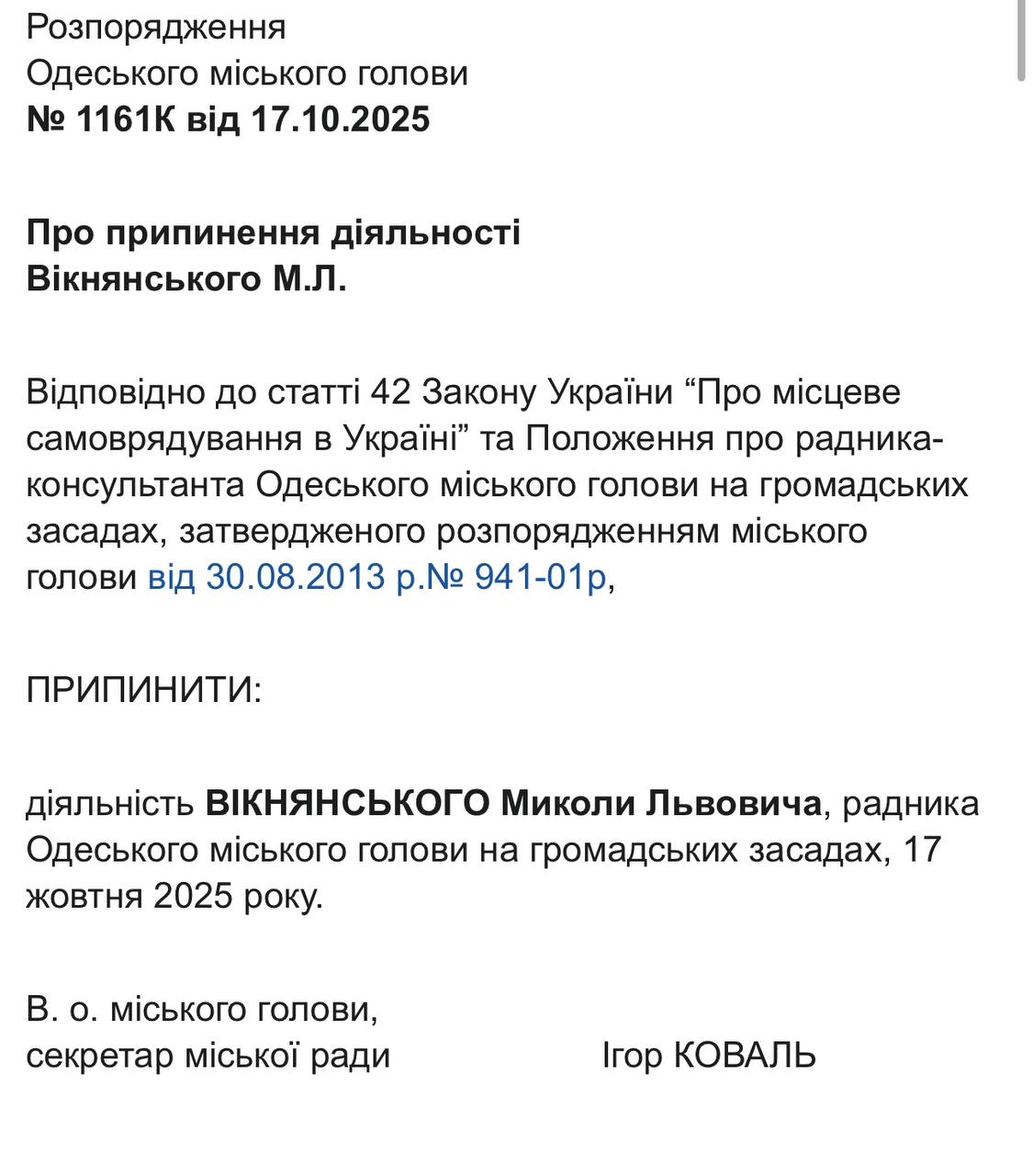 22 жовтня відповідні документи із розпорядженнями виконувача обов’язків міського голови, секретаря Одеської міської ради Ігоря Коваля, оприлюднили на сайті Одеської міської ради. Це стало наслідком втрати Трухановим українського громадянства, після чого він автоматично позбувся посади мера, передає Бессарабія.UA.